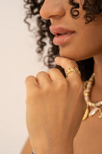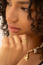 Son anneau fin se pare de motifs sculptés qui rappellent les trésors glanés au bord de l’eau, apportant un éclat chaleureux et un esprit libre. Un bijou tendre et lumineux, qui évoque le soleil sur la peau et les souvenirs salés.