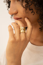 Son anneau doré martelé laisse apparaître des formes ajourées ponctuées de pierres lumineuses, comme des fragments précieux glissés dans une mosaïque d’or. Un bijou audacieux, qui mêle force et finesse, et illumine la main d’un éclat intemporel.