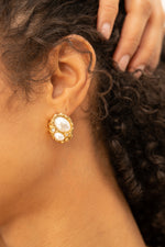 Deux perles nacrées entourées d’un contour doré texturé, comme encadrées par un écrin artisanal.