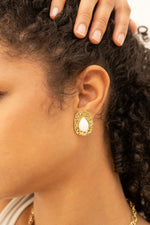Le contraste entre la texture martelée et la douceur laiteuse de la nacre crée une pièce élégante, douce et intemporelle. Un bijou apaisant, délicat, qui illumine le visage d’un éclat subtil.