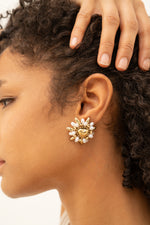 Un petit soleil porté à l’oreille, entouré de perles nacrées et d’un cœur doré en son centre.