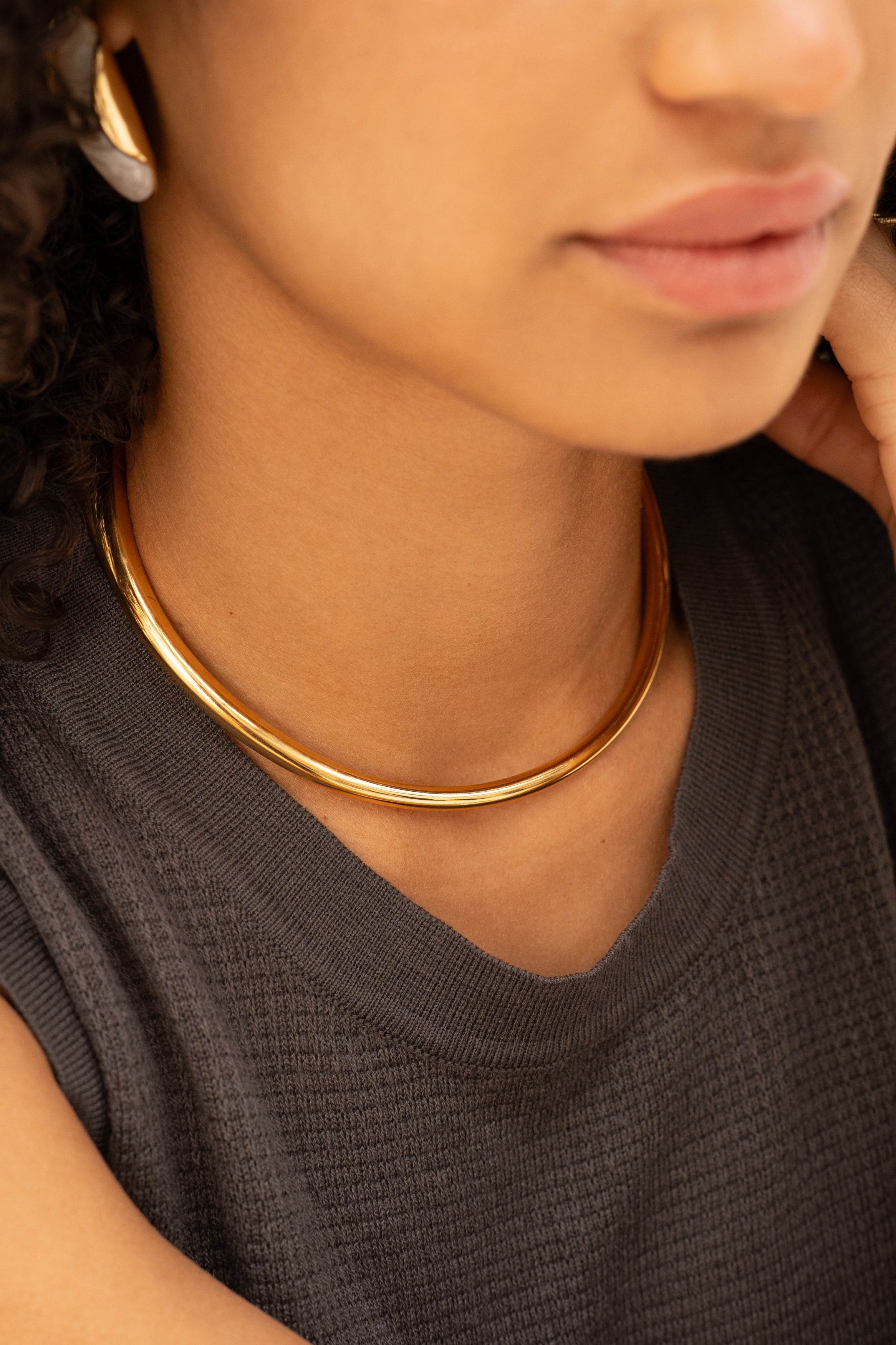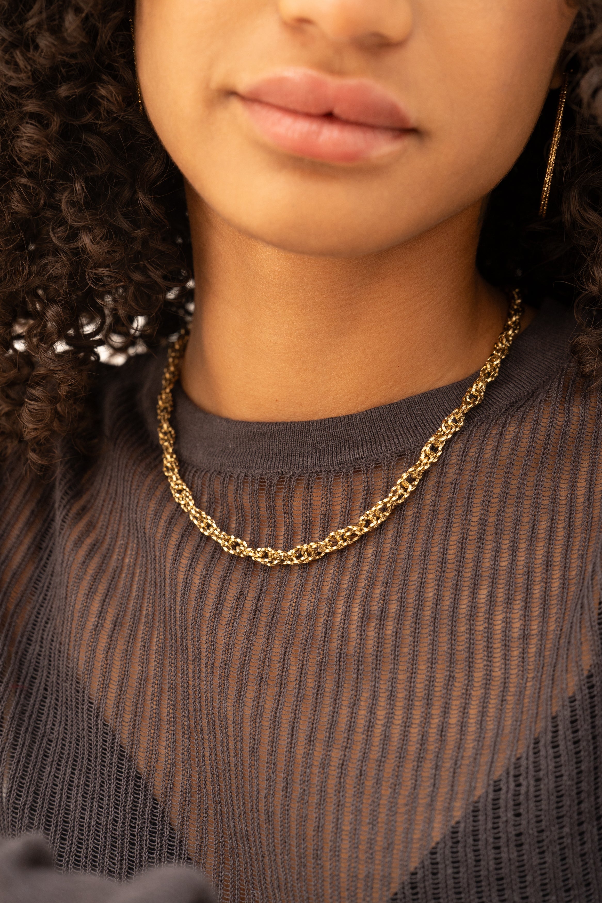 Des petites créoles dorées travaillées comme des vagues qui s’entrelacent.