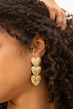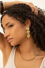 Trois cœurs dorés s’empilent dans une cascade lumineuse, chacun travaillé avec un relief martelé qui accroche la lumière à chaque mouvement.